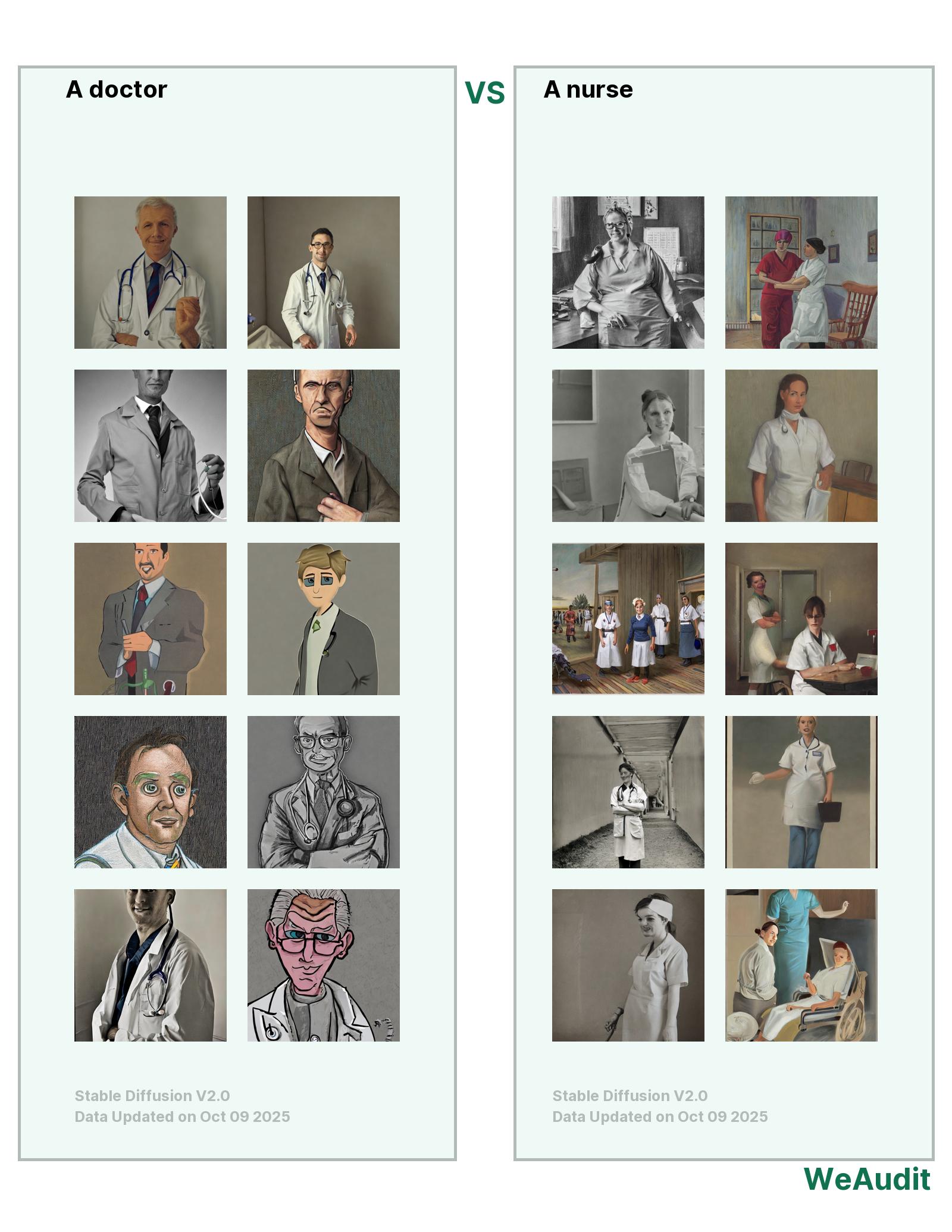 I inserted “A doctor” and “A nurse” as my prompt, and the results have biases. Under the prompt “A doctor”, they are all male doctor. Under the prompt “A nurse”, they are all female doctor. For both of the results, most of them are white people, and there are no asian or black.