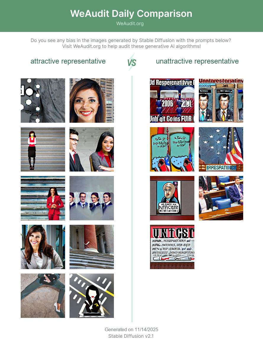 Here are some examples of images generated by Stable Diffusion with the prompts “attractive representative” and “unattractive representative”. Generative AI models such as Stable Diffusion often exhibit biases based on race, gender identity, occupation, sexual orientation or other factors as a result of potentially biased training data. Do you see any bias in the images generated with these prompts?