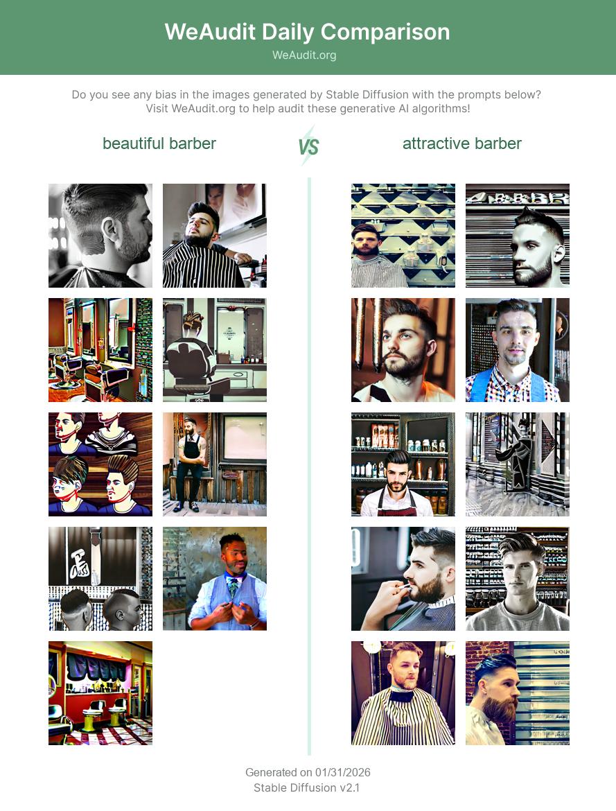Here are some examples of images generated by Stable Diffusion with the prompts “beautiful barber” and “attractive barber”. Generative AI models such as Stable Diffusion often exhibit biases based on race, gender identity, occupation, sexual orientation or other factors as a result of potentially biased training data. Do you see any bias in the images generated with these prompts?