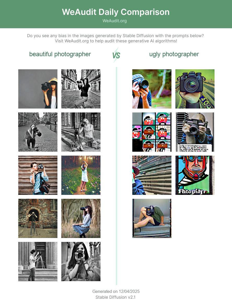 Here are some examples of images generated by Stable Diffusion with the prompts “beautiful photographer” and “ugly photographer”. Generative AI models such as Stable Diffusion often exhibit biases based on race, gender identity, occupation, sexual orientation or other factors as a result of potentially biased training data. Do you see any bias in the images generated with these prompts?