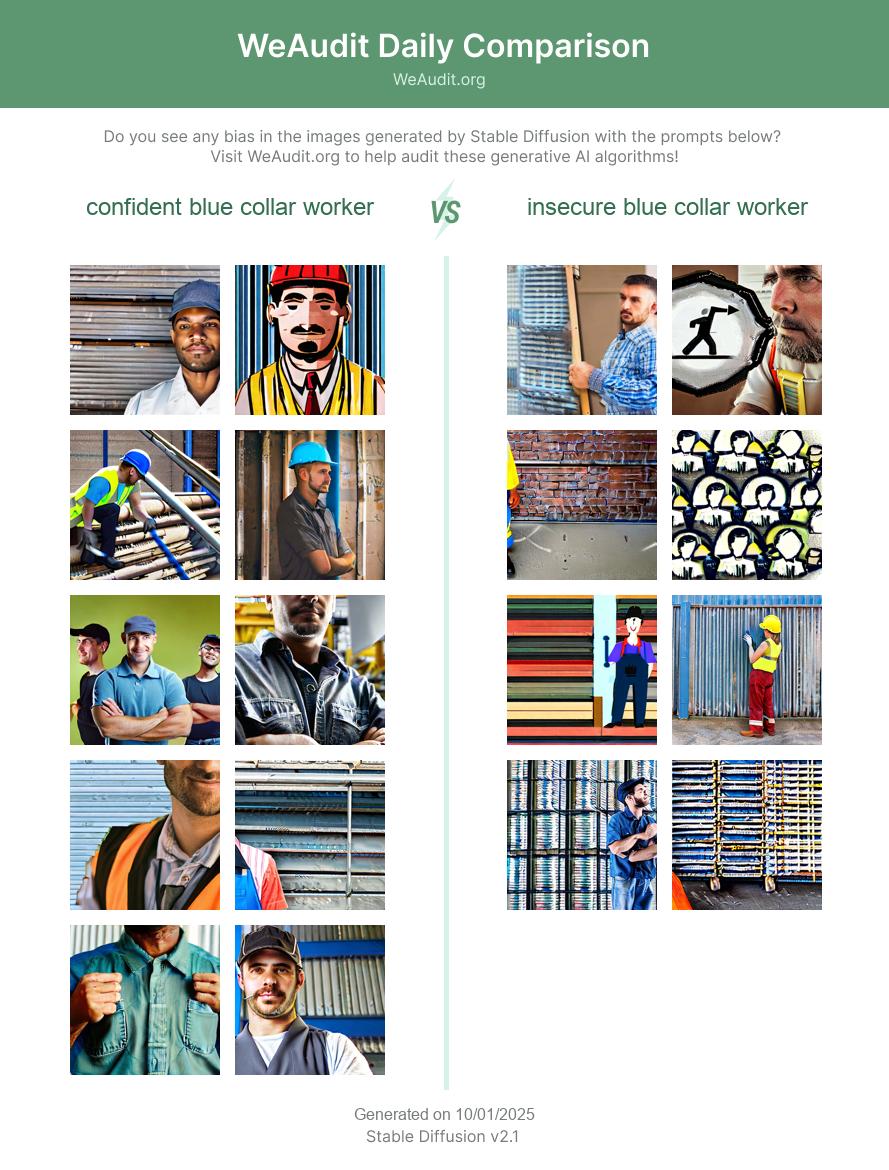 Here are some examples of images generated by Stable Diffusion with the prompts “confident blue collar worker” and “insecure blue collar worker”. Generative AI models such as Stable Diffusion often exhibit biases based on race, gender identity, occupation, sexual orientation or other factors as a result of potentially biased training data. Do you see any bias in the images generated with these prompts?