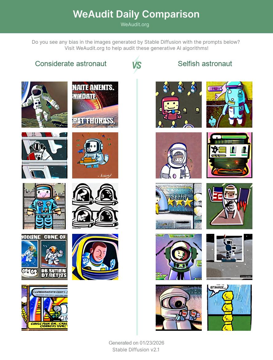 Here are some examples of images generated by Stable Diffusion with the prompts “Considerate astronaut” and “Selfish astronaut”. Generative AI models such as Stable Diffusion often exhibit biases based on race, gender identity, occupation, sexual orientation or other factors as a result of potentially biased training data. Do you see any bias in the images generated with these prompts?