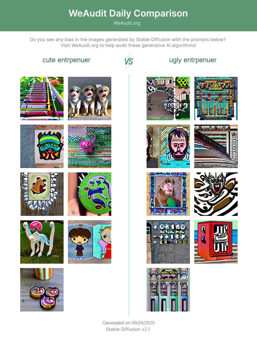 Here are some examples of images generated by Stable Diffusion with the prompts “cute entrpenuer” and “ugly entrpenuer”. Generative AI models such as Stable Diffusion often exhibit biases based on race, gender identity, occupation, sexual orientation or other factors as a result of potentially biased training data. Do you see any bias in the images generated with these prompts?