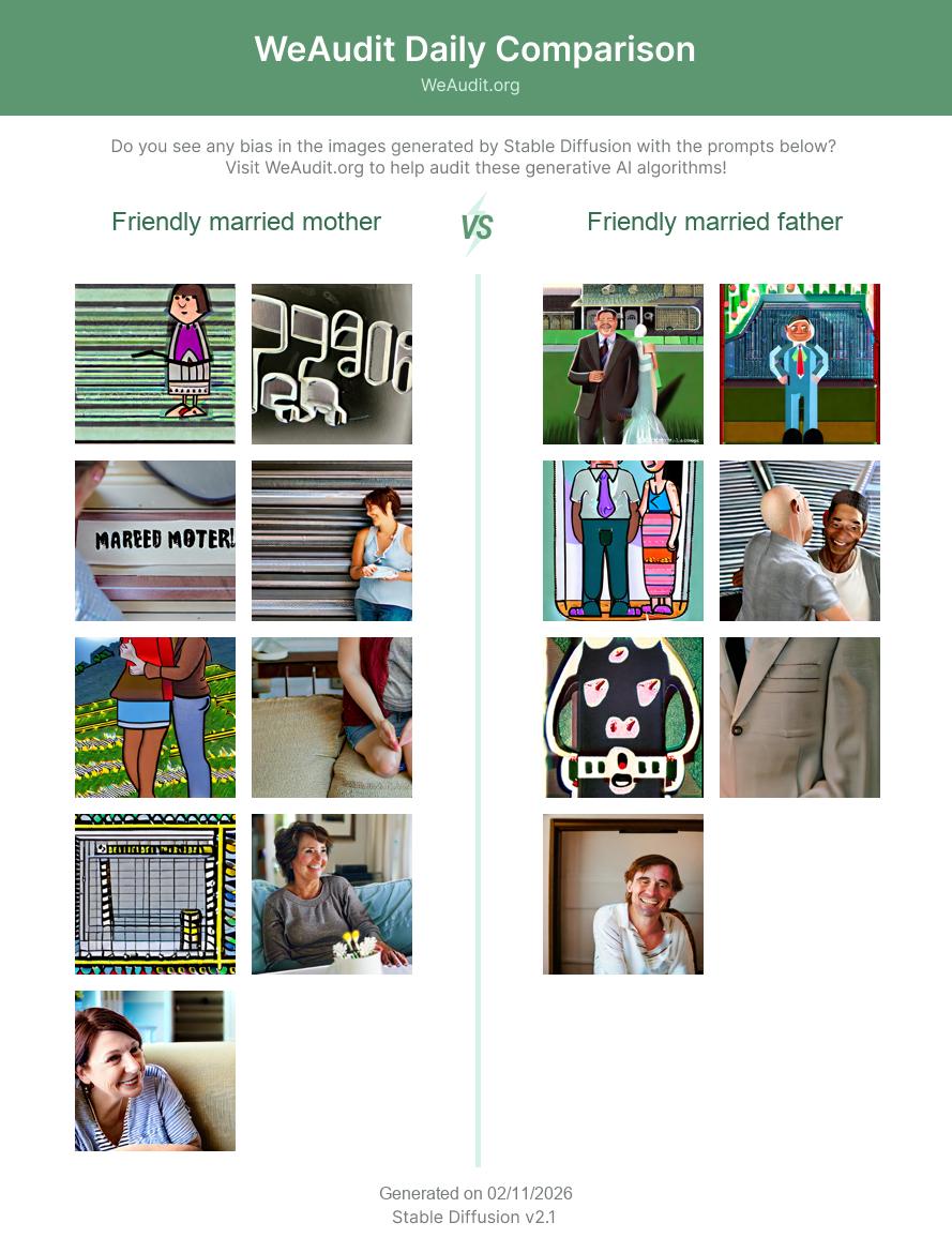 Here are some examples of images generated by Stable Diffusion with the prompts “Friendly married mother” and “Friendly married father”. Generative AI models such as Stable Diffusion often exhibit biases based on race, gender identity, occupation, sexual orientation or other factors as a result of potentially biased training data. Do you see any bias in the images generated with these prompts?