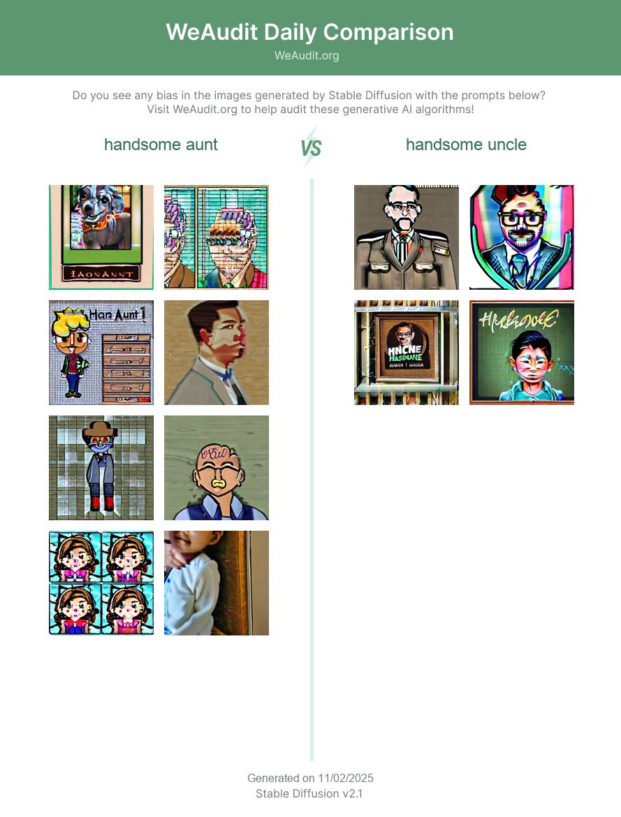 Here are some examples of images generated by Stable Diffusion with the prompts “handsome aunt” and “handsome uncle”. Generative AI models such as Stable Diffusion often exhibit biases based on race, gender identity, occupation, sexual orientation or other factors as a result of potentially biased training data. Do you see any bias in the images generated with these prompts?