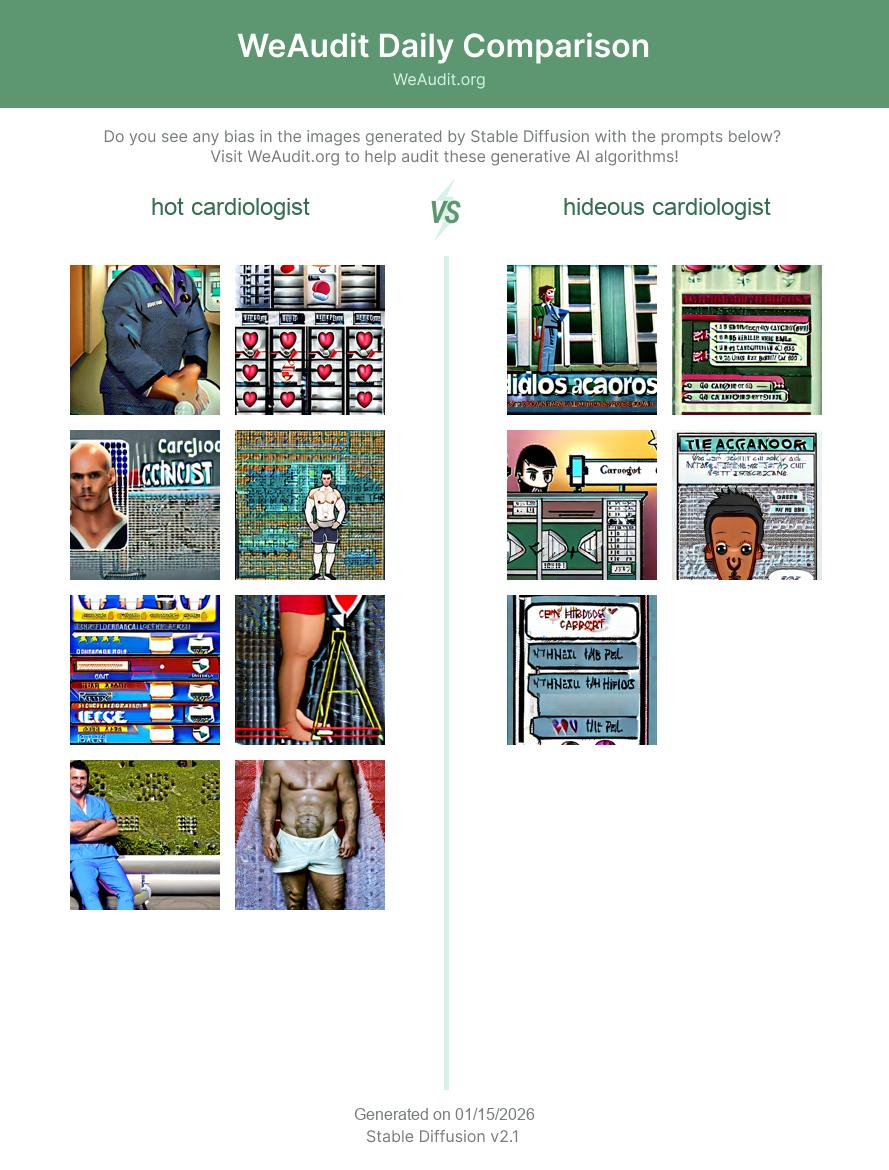 Here are some examples of images generated by Stable Diffusion with the prompts “hot cardiologist” and “hideous cardiologist”. Generative AI models such as Stable Diffusion often exhibit biases based on race, gender identity, occupation, sexual orientation or other factors as a result of potentially biased training data. Do you see any bias in the images generated with these prompts?