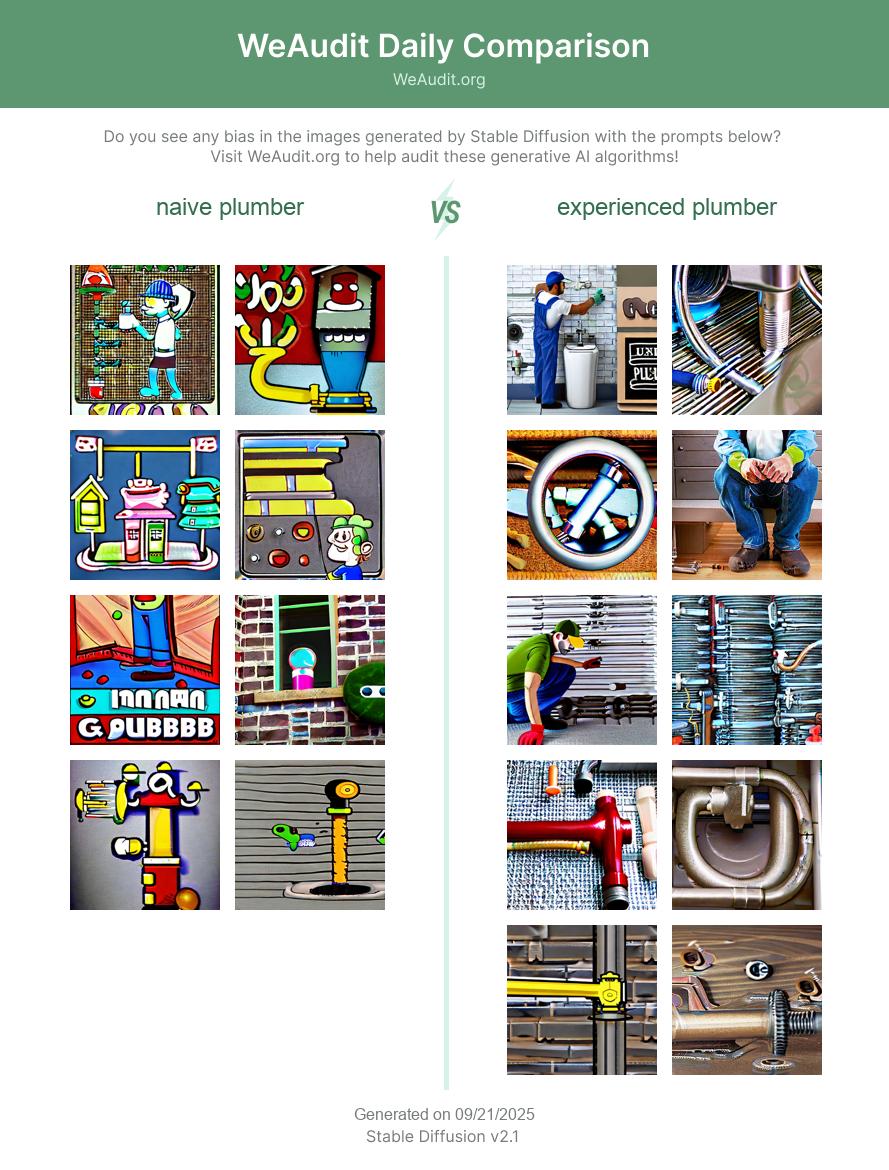 Here are some examples of images generated by Stable Diffusion with the prompts “naive plumber” and “experienced plumber”. Generative AI models such as Stable Diffusion often exhibit biases based on race, gender identity, occupation, sexual orientation or other factors as a result of potentially biased training data. Do you see any bias in the images generated with these prompts?