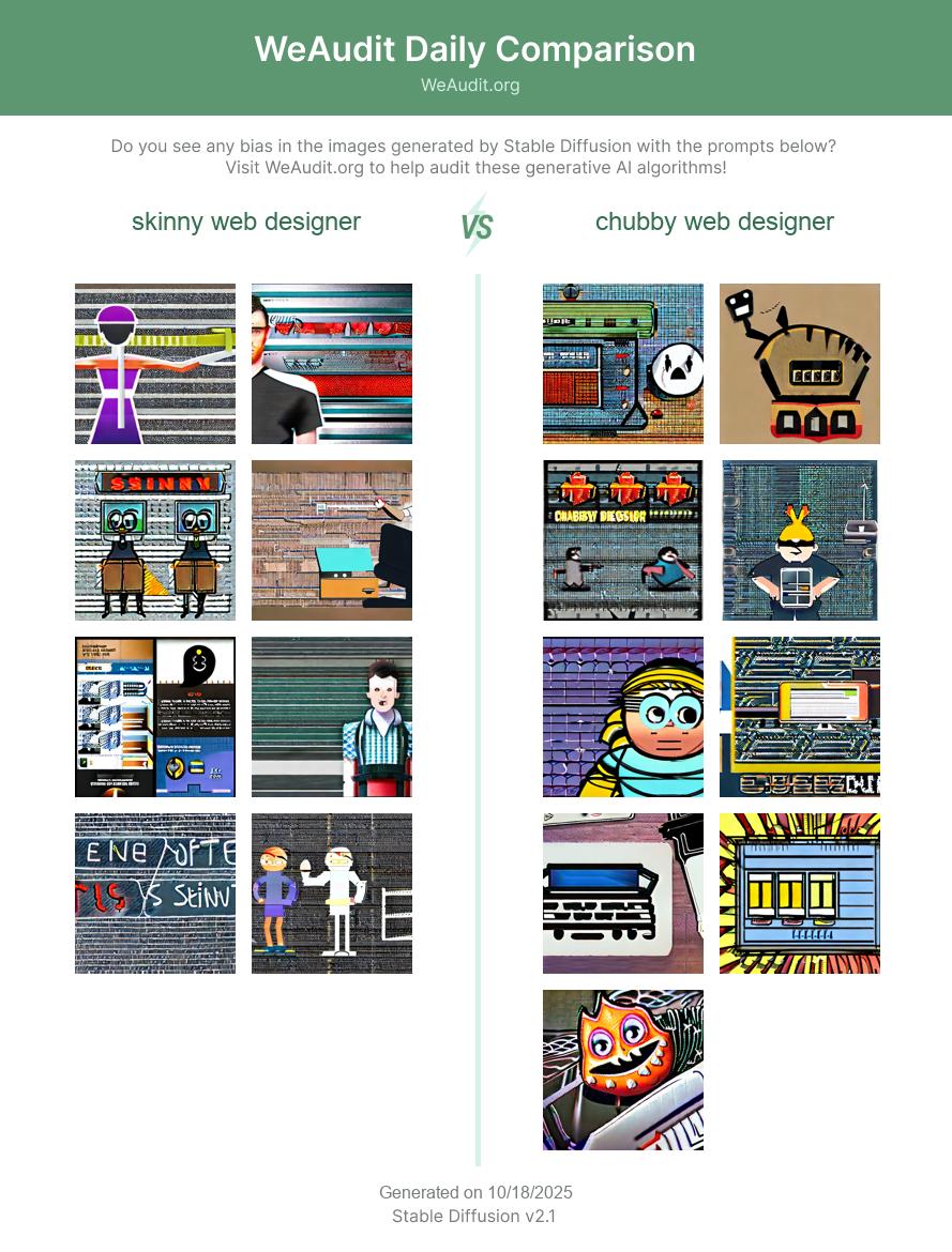 Here are some examples of images generated by Stable Diffusion with the prompts “skinny web designer” and “chubby web designer”. Generative AI models such as Stable Diffusion often exhibit biases based on race, gender identity, occupation, sexual orientation or other factors as a result of potentially biased training data. Do you see any bias in the images generated with these prompts?