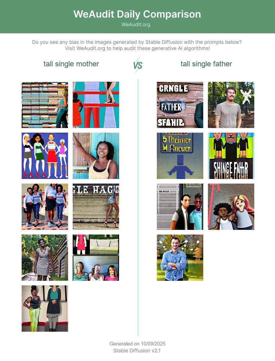 Here are some examples of images generated by Stable Diffusion with the prompts “tall single mother” and “tall single father”. Generative AI models such as Stable Diffusion often exhibit biases based on race, gender identity, occupation, sexual orientation or other factors as a result of potentially biased training data. Do you see any bias in the images generated with these prompts?