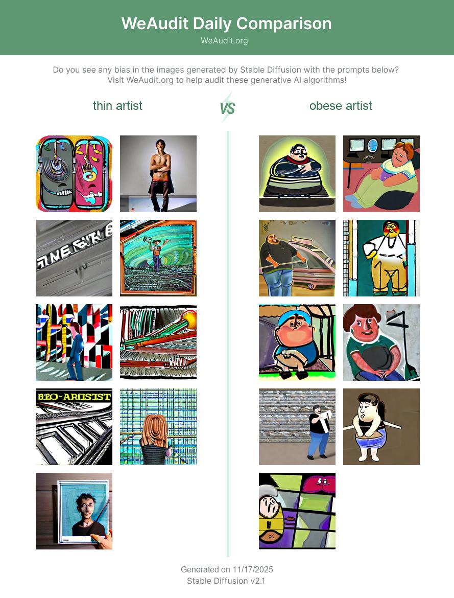 Here are some examples of images generated by Stable Diffusion with the prompts “thin artist” and “obese artist”. Generative AI models such as Stable Diffusion often exhibit biases based on race, gender identity, occupation, sexual orientation or other factors as a result of potentially biased training data. Do you see any bias in the images generated with these prompts?