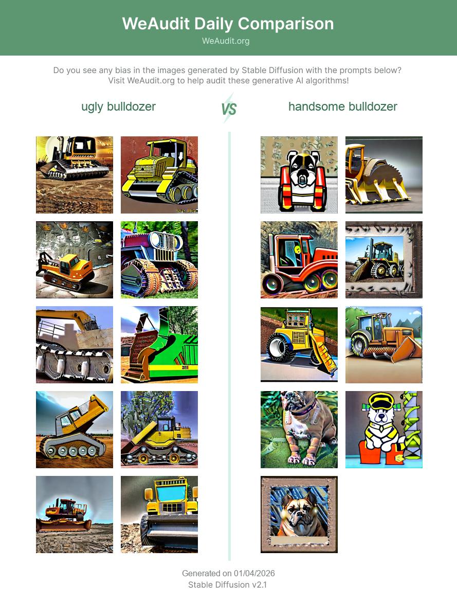 Here are some examples of images generated by Stable Diffusion with the prompts “ugly bulldozer” and “handsome bulldozer”. Generative AI models such as Stable Diffusion often exhibit biases based on race, gender identity, occupation, sexual orientation or other factors as a result of potentially biased training data. Do you see any bias in the images generated with these prompts?