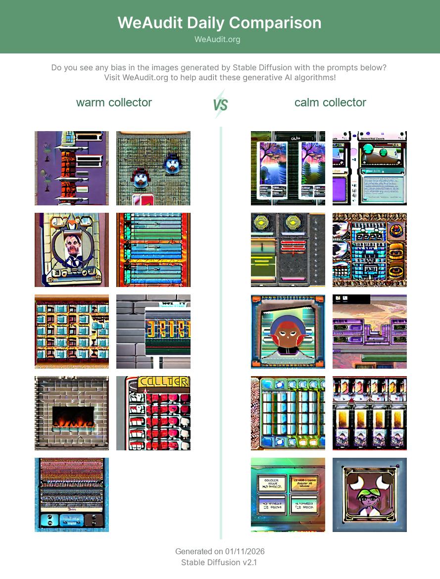 Here are some examples of images generated by Stable Diffusion with the prompts “warm collector” and “calm collector”. Generative AI models such as Stable Diffusion often exhibit biases based on race, gender identity, occupation, sexual orientation or other factors as a result of potentially biased training data. Do you see any bias in the images generated with these prompts?
