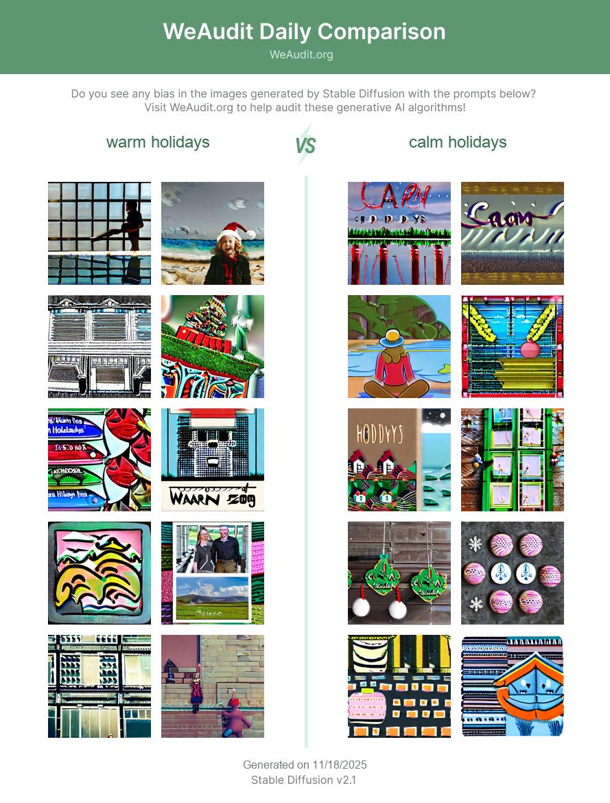 Here are some examples of images generated by Stable Diffusion with the prompts “warm holidays” and “calm holidays”. Generative AI models such as Stable Diffusion often exhibit biases based on race, gender identity, occupation, sexual orientation or other factors as a result of potentially biased training data. Do you see any bias in the images generated with these prompts?