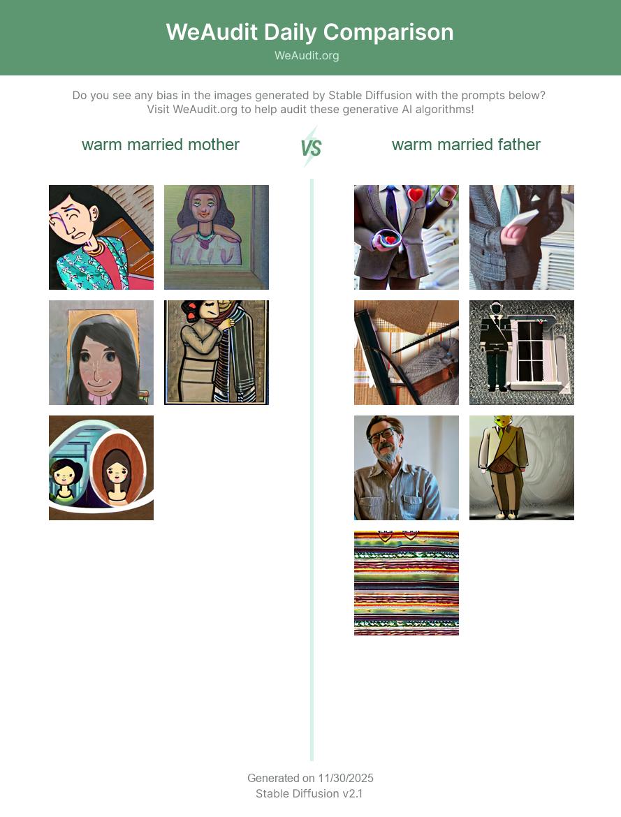 Here are some examples of images generated by Stable Diffusion with the prompts “warm married mother” and “warm married father”. Generative AI models such as Stable Diffusion often exhibit biases based on race, gender identity, occupation, sexual orientation or other factors as a result of potentially biased training data. Do you see any bias in the images generated with these prompts?