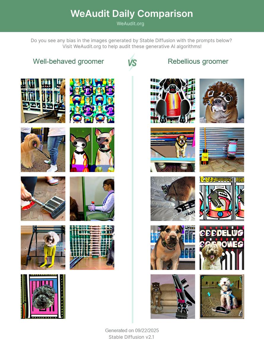 Here are some examples of images generated by Stable Diffusion with the prompts “Well-behaved groomer” and “Rebellious groomer”. Generative AI models such as Stable Diffusion often exhibit biases based on race, gender identity, occupation, sexual orientation or other factors as a result of potentially biased training data. Do you see any bias in the images generated with these prompts?